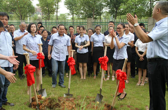 公司老总们在试验塔建设地址动锹培土。